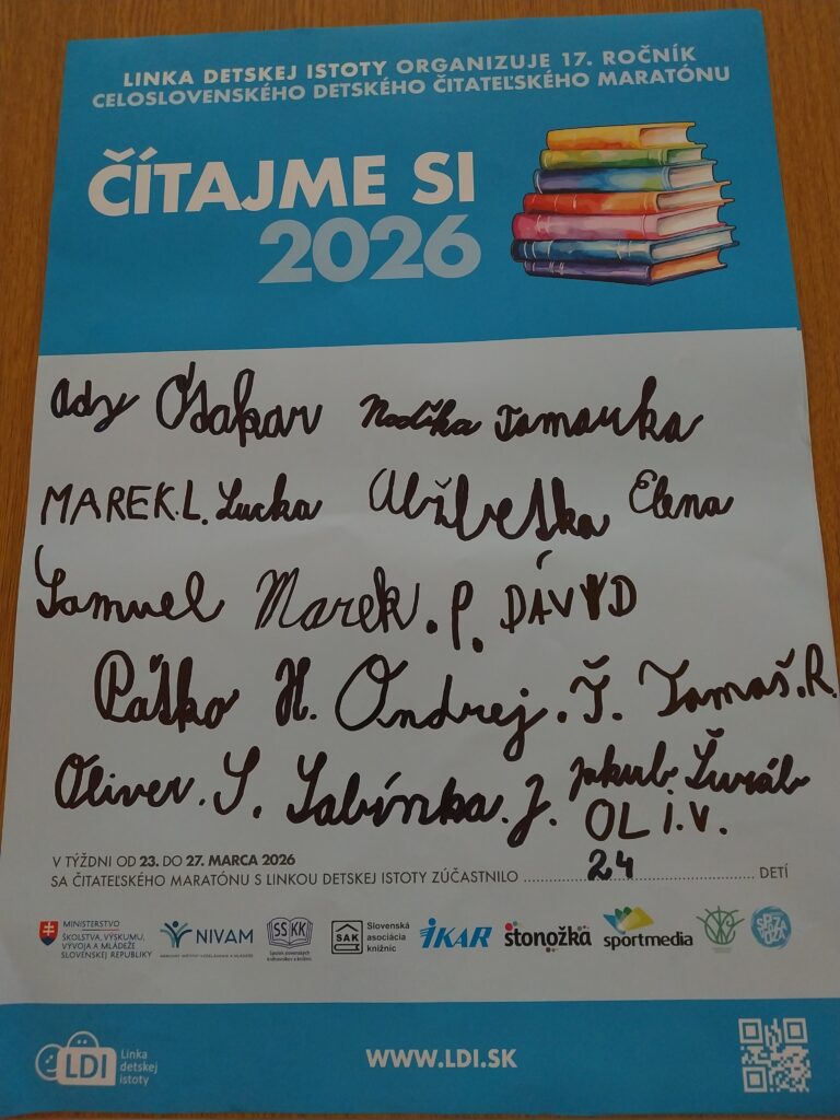 Každý žiak sa zapojil do čítania samostatne a nahlas prečítal kúsok textu pre ostatných z knihy Márie Ďuríčkovej „O Guľkovi Bombuľkovi. Čítali sme 1 hodinu a detského čitateľského maratónu sa zúčastnilo 24 detí. Každý čitateľ sa potom podpísal na prezenčnú listinu a obdržal záložku do knihy.